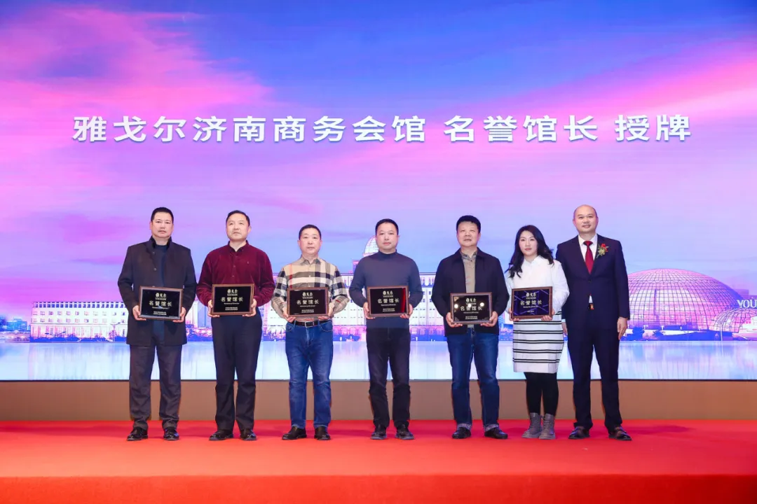 濟南市工程咨詢院事業部總經理金曉光,山東省浙江商會黨支部書記胡小軍,商會副會長、山東省浙江青聯常務副主席毛繼輝,浙商銀行山東分行營業部總經理孫志堅等6位嘉賓受聘擔任雅戈爾濟南商務會館“名譽館長”,雅戈爾山東公司總經理劉建明現場授牌。