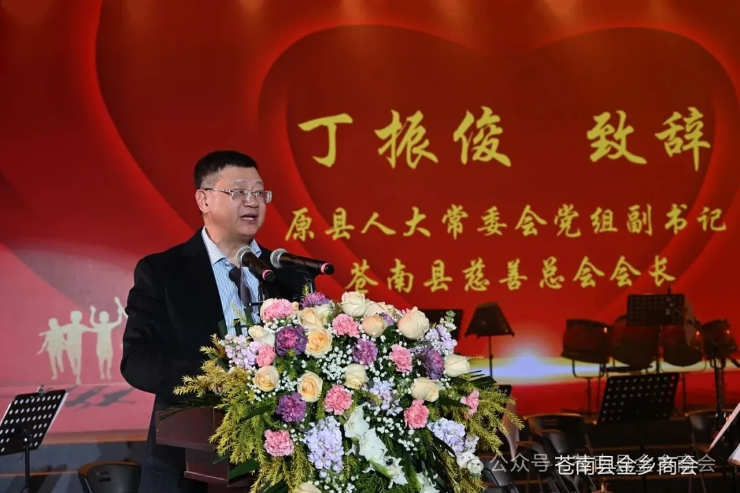 原蒼南縣人大常委會黨組副書記、副主任、縣慈善總會會長丁振俊講話,對大會的召開表示祝賀,并對支持慈善事業的社會各界人士致以敬意和感謝。他說,本次大會將總結展望、表彰典范、踐行慈善與文化賦能相融合,緊扣“慈善走進金鄉”主題,體現了金鄉商企界的責任擔當。他表示,蒼南縣當前正著力構建“五有”慈善生態體系,通過搭建覆蓋全縣18個鄉鎮、6個部門、427個村社的慈善服務網絡、創新實施激勵機制與開發上線數字化系統,推動蒼南慈善事業高質量發展。同時,他說金鄉鎮作為慈善事業蓬勃發展重要力量,去年有21家企業及個人獲縣級慈善表彰,近期35家金鄉愛心企業籌資348萬元,聯合向鎮政府捐贈兩輛消防車,展現了新時代企業家回報桑梓的深厚情懷。最后,他希望金鄉鎮各界繼續攜手,將慈善精神深度融入發展實踐,共同譜寫“商行天下、善行蒼南”的金鄉新篇章,為全面建設溫暖和諧的善行蒼南貢獻更大的金鄉力量。