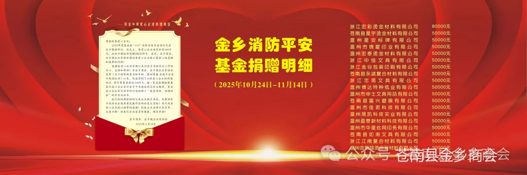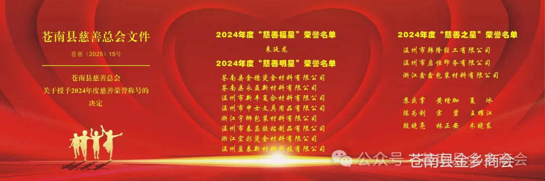 在慈善表彰環節,現場對2024年和2025年慈善先進典型進行了隆重表彰。山東省浙江商會輪值會長、執行會長、日照浙江商會會長、日照陽光廣告彩印包裝有限公司董事長來廷龍等21家金鄉企業及個人慈善貢獻突出,被蒼南縣慈善總會授予2024年度“慈善福星”“慈善明星”“慈善之星”榮譽稱號,并為他們頒發榮譽獎牌。第二項表彰,為弘揚“致富思源、回饋桑梓”的新時代企業家精神,大會特別對近期共同出資348萬元,向鎮政府捐贈2輛消防車的35家金鄉愛心企業予以表彰,并授予“消防之星”榮譽稱號。兩項表彰分別通過頒發榮譽獎牌和綬帶的形式,對獲獎企業與個人的善行義舉給予高度認可與褒揚。
