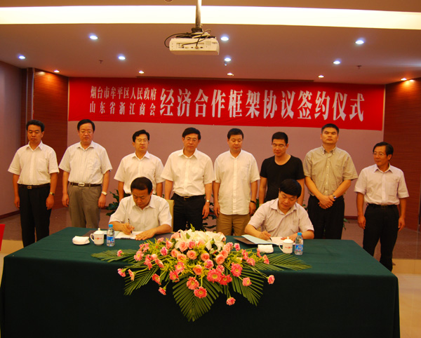 • 8月23日,商會二屆二次會長辦公會議在牟平召開。會前,為進一步加強商會與牟平區政府全面經濟合作,推動雙方合作深入發展,我會與牟平區政府舉行了隆重簽約儀式。簽約儀式由劉天海副書記主持,王中書記代表牟平區委、區政府致歡迎辭。全體與會人員觀看了牟平經濟社會發展短片。林林副區長、章鵬飛會長分別代表牟平區政府、山東省浙江商會簽定雙方經濟合作框架協議。葉樂明、倪士鎮、金位海三位常務副會長見簽。會上,章鵬飛會長被聘任為牟平區政府經濟顧問。