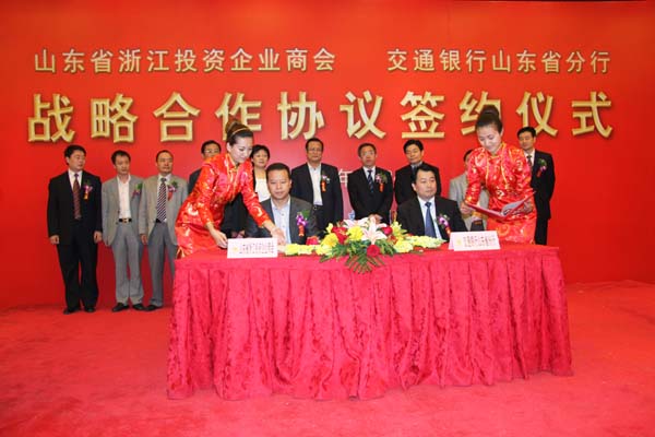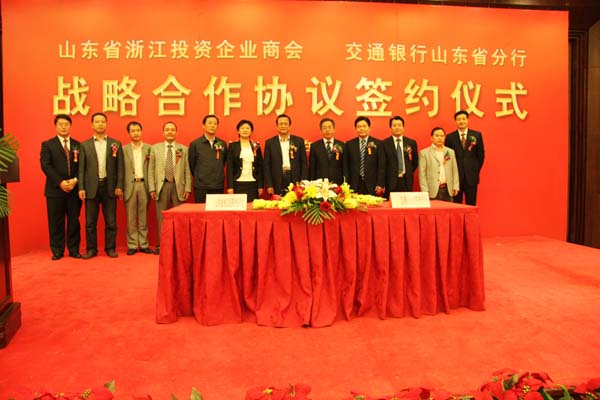 4月24日,我會與交通銀行山東省分行在山東大廈青未了廳簽署了戰(zhàn)略合作協(xié)議。我會為解決中小企業(yè)融資難、貸款難問題,憑借商會平臺,積極推動浙商企業(yè)與銀行之間的合作共贏。