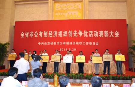 會上,表彰了105個山東省非公有制企業齊魯先鋒黨組織、60個山東省非公有制經濟組織創先爭優活動先進單位和115名優秀共產黨員。