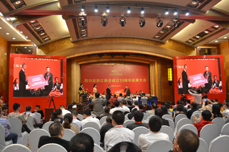 “聚是一團火,散是滿天星”。據介紹,四川省浙江商會成立于2002年10月15日,十年來,在川浙商實力倍增,商會組織規模和實力不斷壯大,會員從成立之初的100余家發展到1226家,并下轄有服裝、家電等分會。與此同時,商會的服務功能也從成立之初老鄉聯誼和會員維權拓展到商機信息、投資考察、聯誼交友、維權、培訓、宣傳和企業家政治進步等功能多元化、服務特色化的一個民間社團組織,成為政府與企業之間聯系溝通的橋梁和川浙兩省經貿合作的平臺。據不完全統計,十年來,商會引導會員為社會困難群體、貧困地區、社會公益及慈善事業、“5·12”汶川特大地震等累計捐款捐物逾2.2億多元。